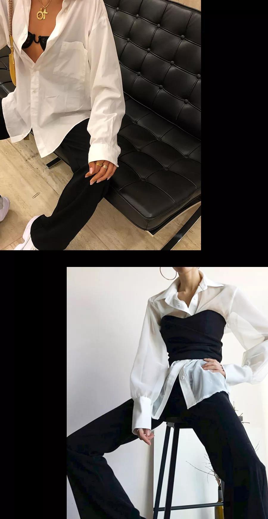 🌼If you want to be cooler, take a different approach to a black oversized shirt to form a set of All Black Look. It’s not bad to stand out from the crowd of white shirts at once.🌼Of course, if you want more proportions, you can simply choose some tailored shirts with a higher waist. For example, a palace style shirt with bandage elements that is very popular this year.